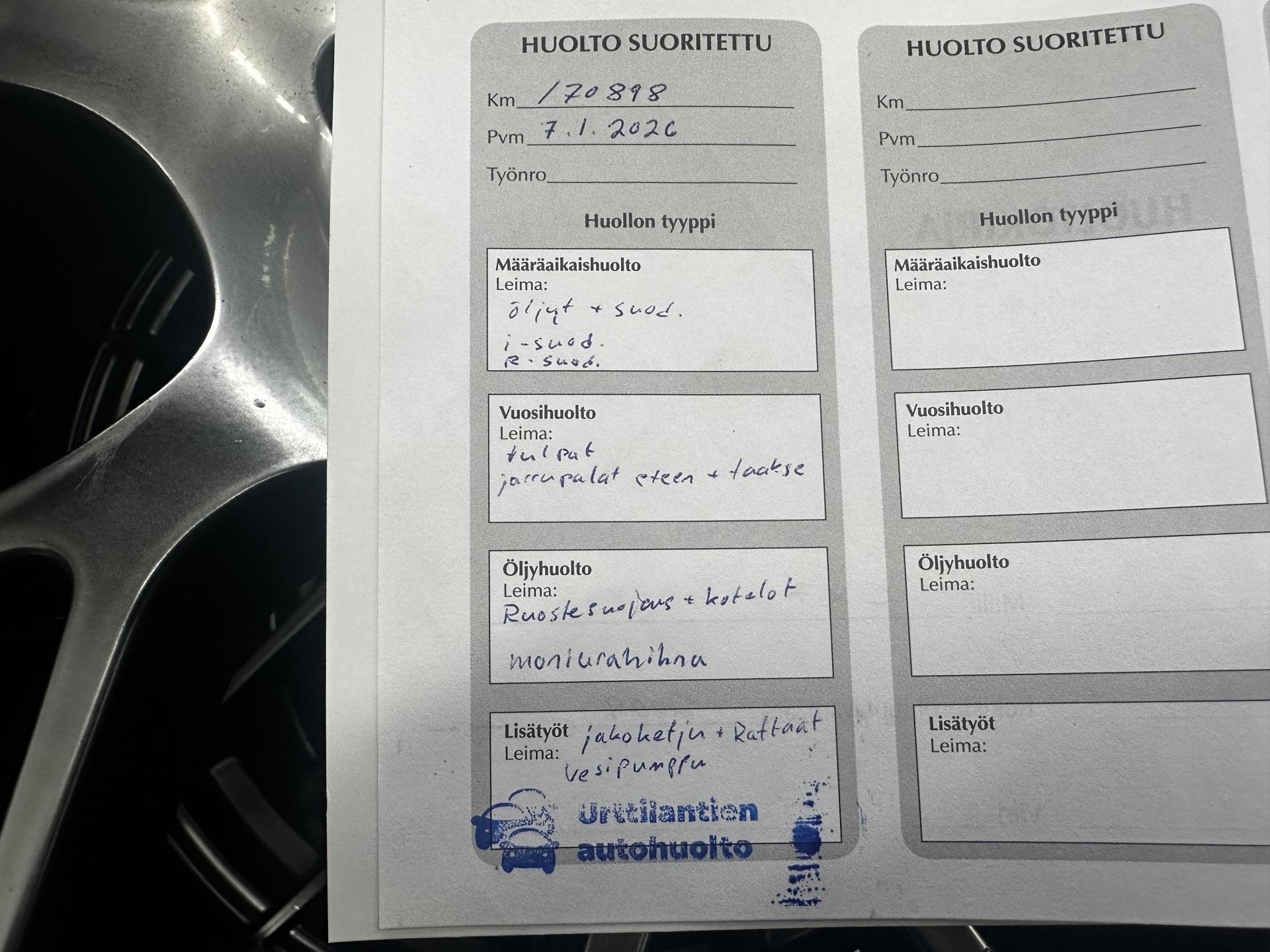 – Juuri huollettu laajemmin sis. öljyt + suodatin, tulpat. ilmasuodatin, jarrupalat, jakoketju + vesipumppu